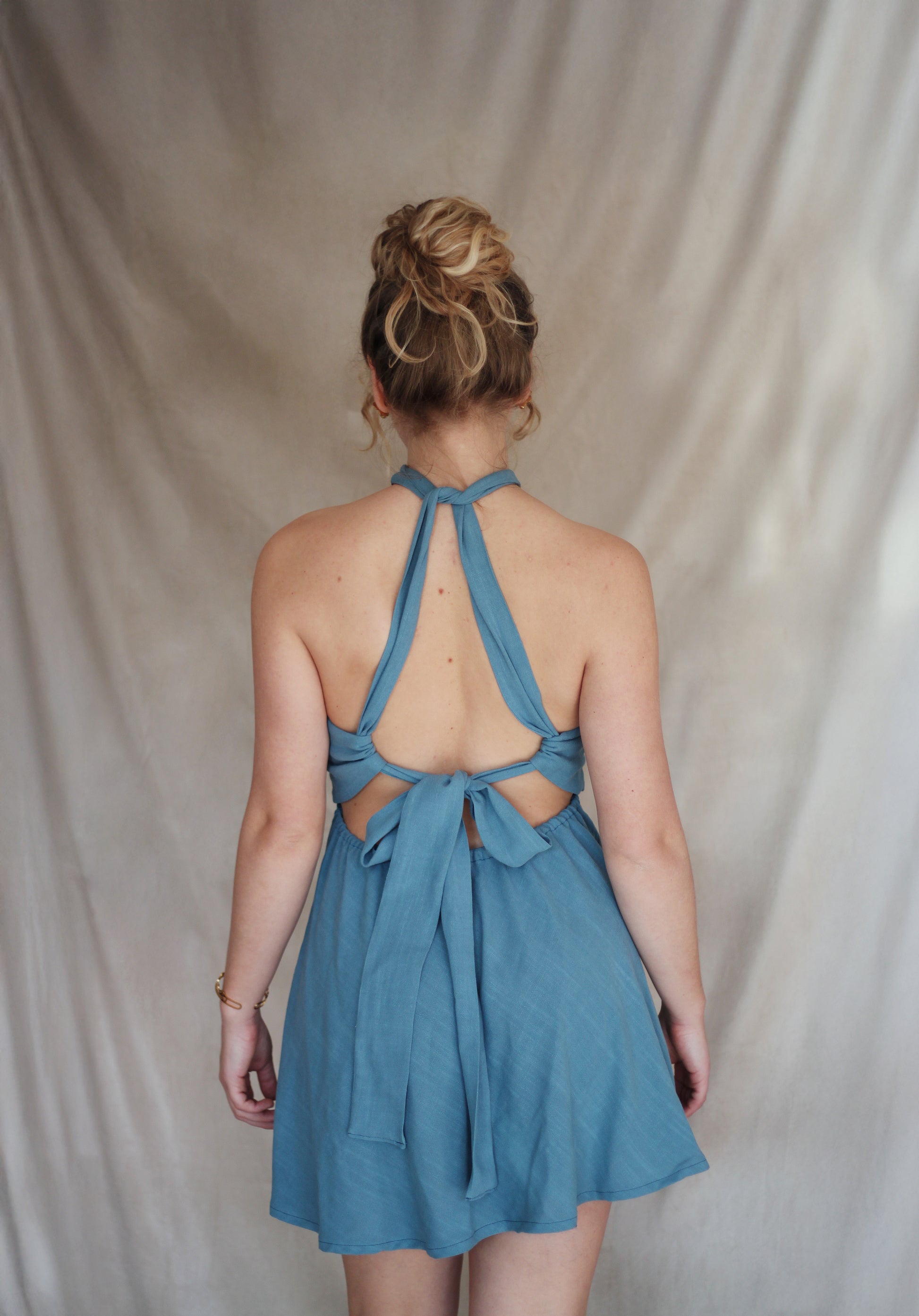 La robe est entièrement ajustable : elle se noue sur le devant au niveau du cou, dispose d’un élastique à la taille dans le dos et se noue également dans le dos pour cintrer la taille.